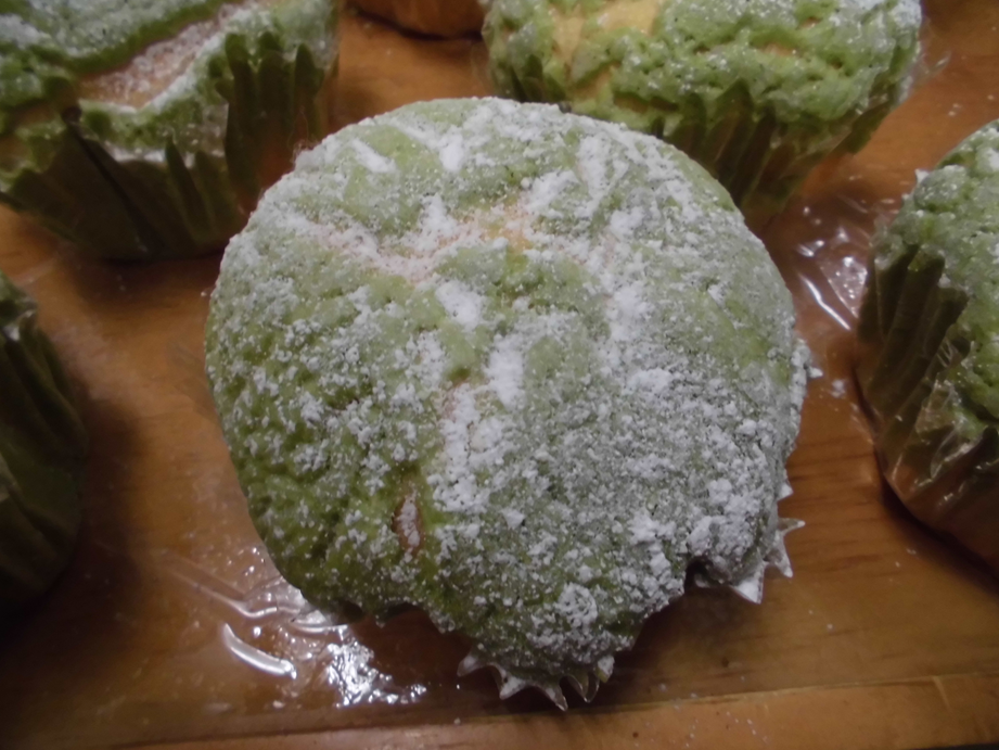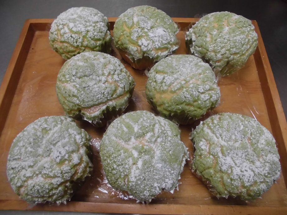 メロン風味のオレンジ色の生地に、緑色のビスケット生地を乗せ、